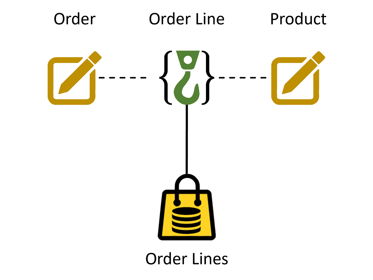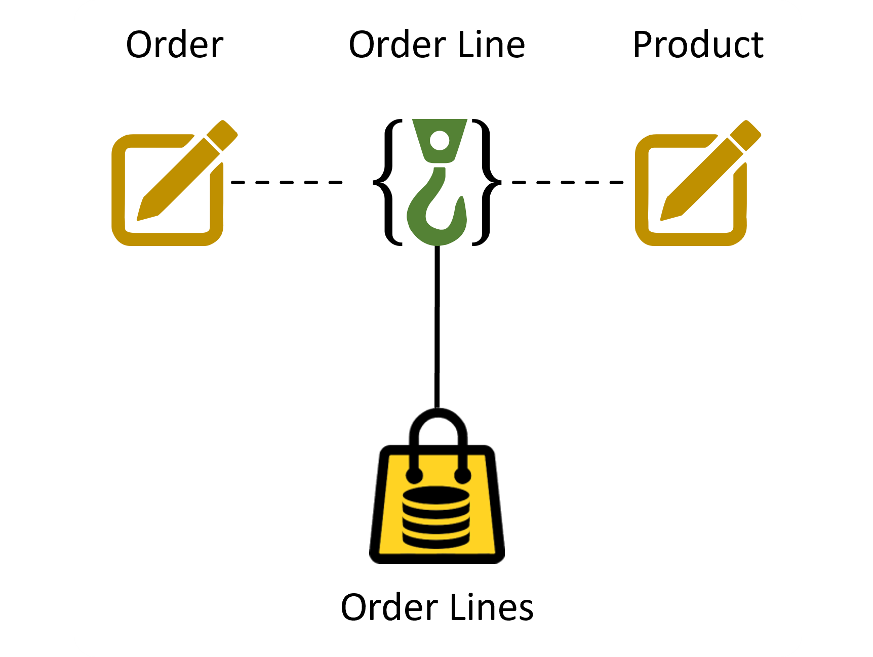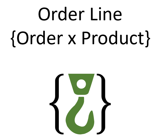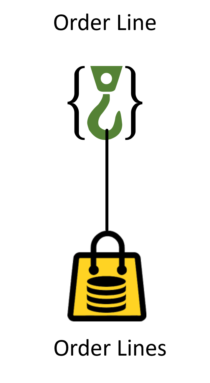 Here is a compound hook labelled Order Line. The symbol for a compound hook is a hook enclosed in braces. We can explicitly show the contributing core business concepts, as shown in Figure 4.5.
