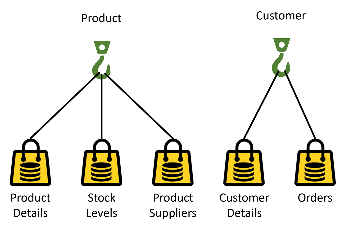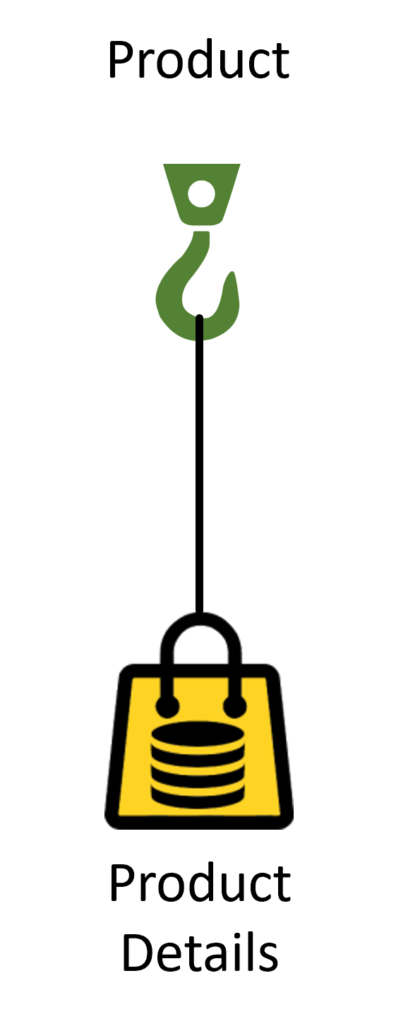 A simple hook represents a single core business concept. By default, there will be a hook defined for every core business concept in the business glossary, which, by convention, will have the same name. If there is a core business concept called Product then there will also be a hook defined with the same name. In Figure 4.1 we can see the Product hook, from which a bag has been hung that contains the Product Details data.