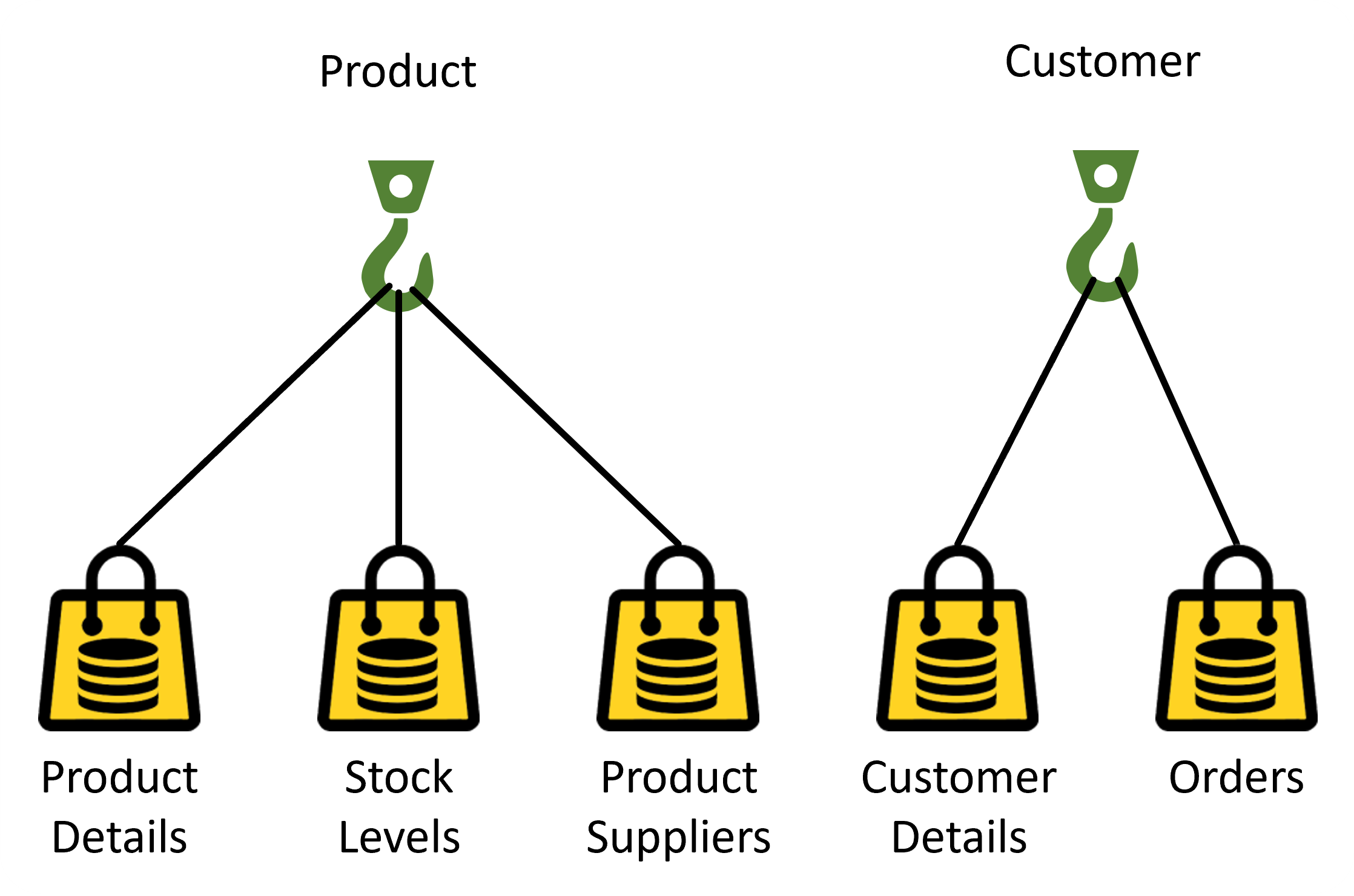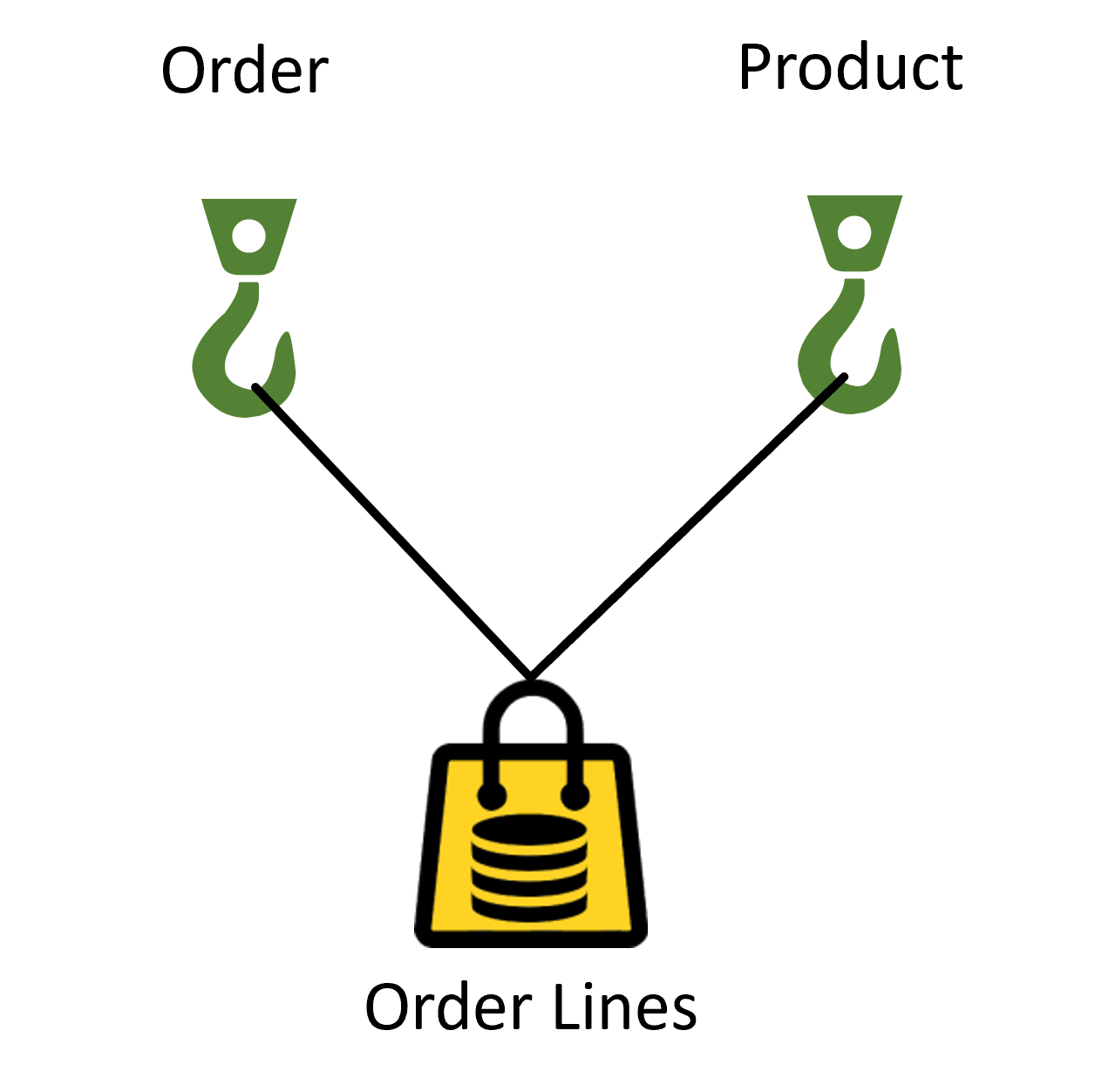 Figure 4.1 shows the Product Details data hanging from a single Product hook, but we can extend our model to allow a bag to hang from more than one hook. Figure 4.3 shows the Order Lines Bag hanging from the Order and Product hooks. In effect, the Order Lines data has been classified into both Order and Product categories.